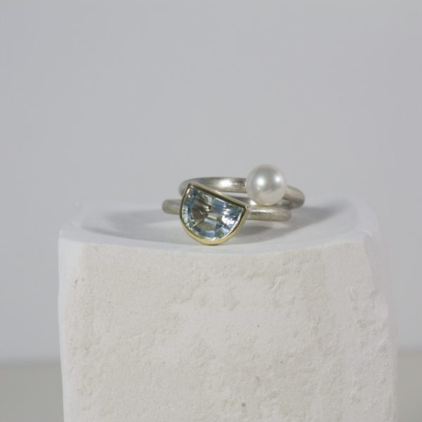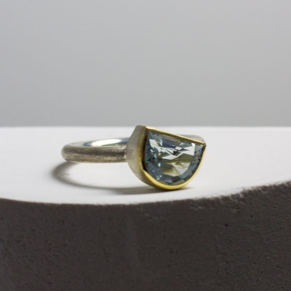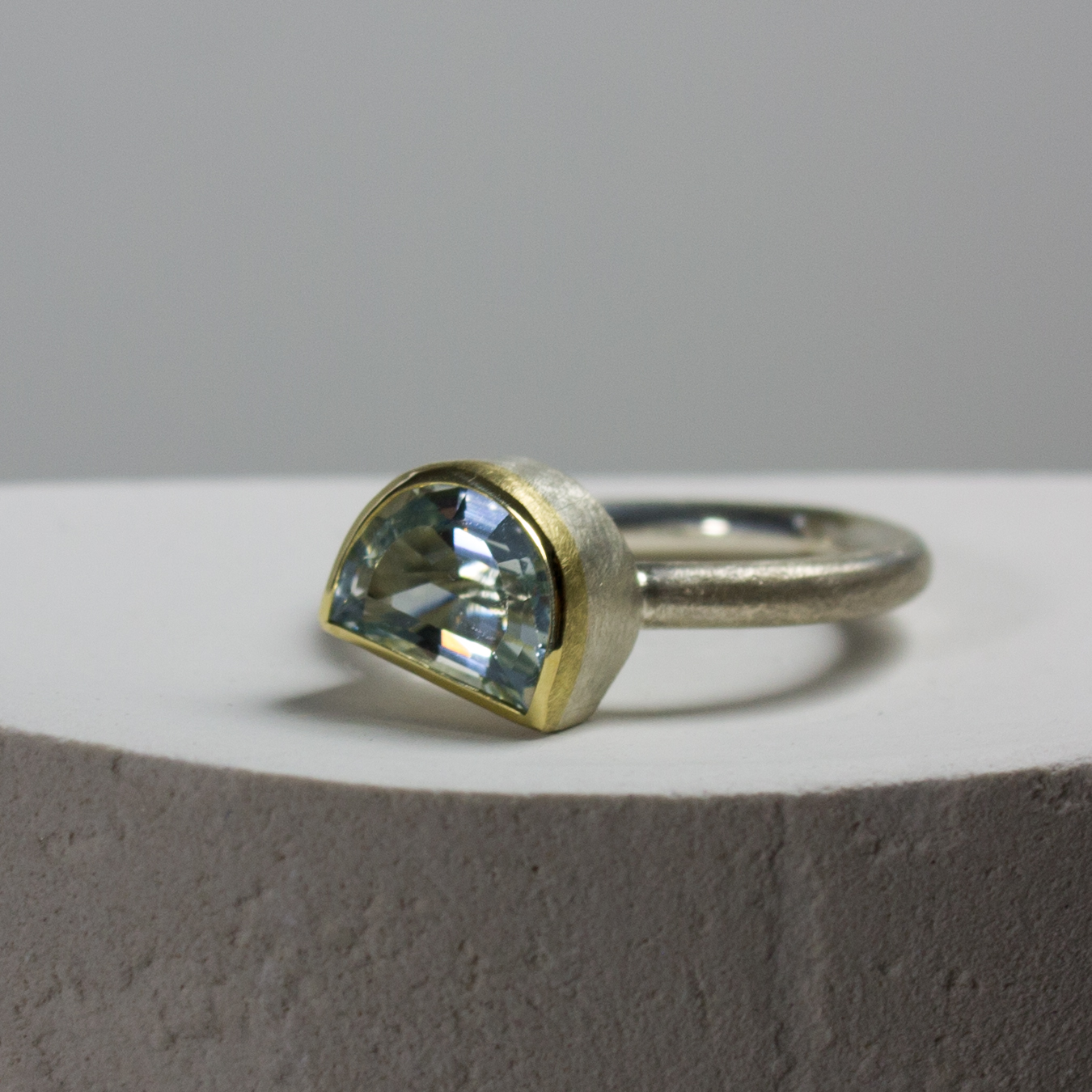 Handgearbeiteter Silberring mit 750/- Goldfassung, der Ring kann wie im Fotobeispiel mit anderen Ringen kombiniert werden. Hier mit einem Aquamarin Stein in Halbmondform facettiert geschliffen. Ringweite: 54 , Ringschiene rund Profil: 2,5 mm, Stein mit Fassung : 8 x 10 mm